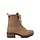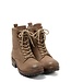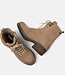 Taupe nubuck leather women's ankle boots from the new winter collection of the Dutch brand Lazamani, item number 68.087 Taupe. These sturdy lace-up boots are made entirely of leather, lined with soft faux fur, and have a removable leather insole. The high, chunky track sole is made of brown rubber. The nubuck leather is lightly polished on the toe and heel, giving it a rugged look. The boot closes with a taupe lace and a zipper for easy on and off. This style fits snugly around the ankle. Wear it casually with jeans or style it with a dress or skirt.