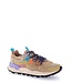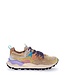Beige with yellow, pink, lilac, purple, orange, and turquoise women's sneakers. From the new 2025 fall/winter collection of the Japanese brand Flower Mountain, item Yamano 3 woman suede/teddy, color Beige Multi. This trendy sneaker is made of synthetic teddy fabric and features seven different suede colors. The shoe has a removable cork footbed and an off-white, purple, and black rubber sole with a tread pattern. The sole is black. The lining is made of leather combined with fabric, which is wonderfully soft to wear. The sneakers fasten with a round purple and lilac lace. The color combination and cut-out patterns make the shoe cool, playful, and striking. The fit is slightly wider at the forefoot than average. The Yamano sneakers combine active details with a cool aesthetic, making them perfect as everyday running shoes.