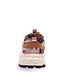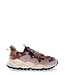 Pink, brown, and black women's sneakers. From the new 2025 fall/winter collection of the Japanese brand Flower Mountain, item Kotetsu Uni Suede/Ecofur Dust Brown. This trendy sneaker is made of faux fur with a leopard print and four different suede colors: pale pink, camel, black, and pink. The shoe has a removable cork footbed and an off-white and black speckled rubber sole with a tread. The sole is black. The lining is made of a pink fabric that is wonderfully soft to the touch. The sneakers fasten with round, white and black laces. The color combination, cutout patterns, and the material give the shoe a cool, playful, and striking look. The Kotetsu sneakers combine active details with a cool aesthetic, making them perfect for everyday running.