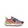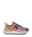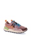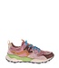 Pink with brown, beige, camel, purple, turquoise, and orange women's sneakers. From the new 2025 fall/winter collection of the Japanese brand Flower Mountain, item Yamano 3 woman suede/teddy Taupe-Beige-Orange. This trendy sneaker is made of synthetic teddy fabric and features five different suede colors. The shoe has a removable cork footbed and an off-white, lime, and grey rubber sole with a tread pattern. The bottom of the sole is grey. The lining is made of leather combined with fabric, which is wonderfully soft to wear. The sneakers fasten with round, turquoise and brown laces. The color combination and cut-out patterns give the shoe a cool, playful, and striking look. The fit is slightly wider at the forefoot than average. The Yamano sneakers combine active details with a cool aesthetic, making them perfect for everyday running.