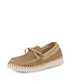 Lightweight women's loafers in a beautiful dark beige color from the Danish brand Ilse Jacobsen, item number Tulip Boat Shoe 3074 Latte Pearled Ivory. These slip-ons are made of recycled microfiber with a decorative, laser-cut perforated pattern. The upper is attached to the sole with recycled thread. No glue is used. The shoe's interior is unlined and features a soft, thick, comfortable, removable footbed covered in suede. The flexible, off-white sole is made of natural rubber, with a striking pattern and anti-slip tread. The bow is a nice detail. Super cute loafers with a very comfortable fit. The boat shoe look is totally on-trend this summer. The sole is 2 cm thick and 2.5 cm at the heel.