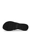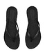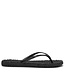 Lightweight women's flip-flops with matte black strap from the Danish brand Ilse Jacobsen, item number Cheerful02 color 001 Black. The flip-flops are light and flexible. The structured sole makes the slippers comfortable and creates a soft massage effect. The whole is made of rubber with PVC. The top band is nice and narrow, matte black and with the name Ilse Jacobsen on it. Stylish basic slippers with a very comfortable fit. Sole is 1.5 cm thick and 2 cm at the heel.