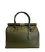 Olive green leather, luxury ladies doctor bag model shoulder bag from the Italian bag brand Modarno. This elegant bag is made of grain leather with two short handles and a long green leather strap to carry the bag over the shoulder or crossbody. It opens and closes with a rotating clip closure. The metal accessories are gold-colored. The inner lining is black in color and is made of a woven fabric. The inside is divided into two large compartments with a zip pocket in the middle, against one side there is a small zip pocket and against the other a small leather insert pocket. A nice detail is the key ring that hangs on the short handle. This can be removed. Stiff structure and excellent finishes, product with an excellent price-quality ratio. A bag for all occasions.