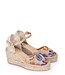 Beige women's espadrilles by the Spanish brand Pedro Miralles, article number 17731-03 Talima Beige. The espadrilles are made of beige suede combined with beige linen on which is beautifully embroidered with multi-coloured velvet thread and gold thread. The shoe is lined with soft leather on the inside, has a fixed footbed and the rubber sole is natural in colour. The wedge heel is made of the well-known espadrille rope with a gold thread through it. The sandal closes with a narrow brown leather strap with a gold-coloured buckle. A beautiful, colourful espadrille with the well-known good fit of Pedro Miralles. Combine it with a summer dress. The heel height is 8 cm and the platform height is 3 cm.
