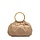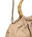 Medium-sized beige linen handbag with sturdy round bamboo handles. Includes a long shoulder strap and closes securely with a zipper. Read more..