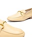 Modern square-toe women's loafers with a gold-tone horsebit from the Spanish brand Unisa, item number Belgi _ NTO Chamomile. These loafers are partially lined with leather and fabric and have a flexible, natural rubber, non-slip sole. The insole is padded with soft foam for extra comfort. The fabric lining gives the loafer a casual look. The small leather heel has a woodgrain look. A beautiful detail is the metal embellishment on the vamp. A timeless and versatile choice, ideal for adding a feminine and elegant touch to your everyday outfit.