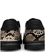 Leather with a taupe/black snake print women's sneakers from the new fall/winter 2025 collection by the Danish brand Woden, item WL655 Nora Natural Soft 856 Snake. These super-nice sneakers are lightweight, have a removable cork footbed, and a black and taupe mottled rubber sole with a tread. The lining is made of fabric that is wonderfully soft to wear. The sneakers fasten with flat black cotton laces. The leather has a slight sheen, giving it a snakeskin-like appearance. A stylish and comfortable city.