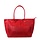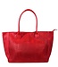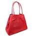 Red leather, with crocodile print, ladies shoulder bag from the Italian bag brand Zeen. Item name Zen. Lola Rouge Leather. This bag is made entirely of leather and has a beige fabric lining. This model is equipped with two red leather shoulder straps, firmly and visibly attached to the outside. The inside is one large compartment and has a small zipper pocket against the side. The bag closes with a zipper and the model then shows wide (see image). Or you close it with the straps with press stud and magnetic closure and the model becomes narrower, more pyramid-shaped. (See the second photo).