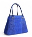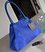 Royal blue suede, partially embellished with a crocodile print, women's shoulder bag from the Italian bag brand Zeen. Product name: Lola Croco Electric Blue. This bag is made entirely of suede and has a beige fabric lining. This model features two blue leather shoulder straps, securely and visibly attached to the outside. The interior is one large compartment with a small zippered pocket and slip pocket on the side. The bag closes with a zipper, making it wider than a shopper bag (see the third photo in the gallery). Alternatively, you can close it with the straps, which have a snap and magnetic closure, making it narrower, pyramid-shaped, as shown in the first photo.