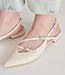 beige leer dames loafers met hiel en wreefbandjes uit de nieuwe zomer collectie van Dolce Vita, artikel Pamla Pearl Ivory Leather. Deze stijlvolle sandalen zijn geheel van glanzend beige leer, met imitatie leer gevoerd en de leer look zool is flexibel zonder profiel. Het kleine 2 cm hakje is met hetzelfde beige leer bekleed. De binnenzool is voorzien van memory-foam waardoor het heel zacht aanvoelt, het zit vast en is niet uitneembaar. De voorkant van de schoen is gestyled als een ballerina, de achterkant is als een sandaal open en sluit met een verstelbare smalle hielband met een verfijnd zilver gespje met pareltjes erin verwerkt. Eenzelfde bandje met gesp gaat ook over de wreef en voor over de voet. De bandjes geven de zomerschoenen een moderne vlotte look. De vorm van de neus is puntig. Draag het stijlvol met een jeans of combineer ze zomers met een jurk of rok.