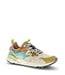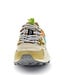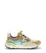 Beige gecombineerd met verschillende kleuren zoals geel, roze, oranje, mint en blauw sneakers. Komt uit de nieuwe 2026 lente/zomer collectie van het Japanse merk Flower Mountain, artikel Yamano 3 Woman suède/nylon kleur: cream, milk, light blue. Deze opvallende trainers zijn gemaakt van suède gecombineerd met een technische stof. De schoen heeft een uitneembaar kurk voetbed, een off-white met mint lichtgewicht tussenzool en een grijs rubber loopzool met grof profiel. De voering is gedeeltelijk van stof en gedeeltelijk van leer. De sneakers sluiten met een ronde, gebroken wit met grijze veter. De kleuren combinatie samen met de uitgesneden patronen maken de schoen stoer, speels en opvallend. De leest valt iets langer en breder bij de voorvoet dan gemiddeld.