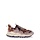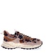 Roze met bruin en zwart dames sneakers. Komt uit de nieuwe 2025 herfst/winter collectie van het Japanse merk Flower Mountain, artikel Kotetsu Uni suede/Ecofur Dust Brown. Deze trendy sneaker is gemaakt van imitatiebont bewerkt met een luipaardprint en er zijn vier verschillende kleuren suede verwerkt: bleekroze, camel, zwart, pink. De schoen heeft een uitneembaar kurk voetbed en een gebroken wit met zwart gespikkelt rubber zool met profiel. De onderkant van de zool is zwart. De voering is gemaakt van een roze kleurige stof wat heerlijk zacht draagt. De sneakers sluiten met een ronde, wit met zwarte veter. De kleuren combinatie en uitgesneden patronen, het materiaal, maken de schoen stoer, speels en opvallend. De Kotetsu-sneakers combineren actieve details met een coole esthetiek en functioneren daardoor perfect als dagelijkse loopschoen.
