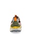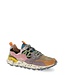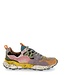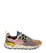 Beige gecombineerd met verschillende kleuren zoals zalm, grijs, roze, lila, groen, mosterd, blauw en oranje dames sneakers. Komt uit de nieuwe 2025 herfst/winter collectie van het Japanse merk Flower Mountain, artikel Yamano 3 Woman suède/nylon/knit kleur Light Mustard-Grey-Cipria. Deze opvallende trainers zijn gemaakt van suède gecombineerd met een nylon en rib stof. De rib stof is bewerkt met een luipaard patroon. De schoen heeft een uitneembaar, antibacterieel, van natuurlijk kurk, voetbed. De ultra lichte rubberen zool is off-white met mosterd geel van kleur en met zwarte spikkels er doorheen. De grijze onderkant heeft een grof anti slip profiel. De voering is gedeeltelijk van stof en gedeeltelijk van leer. De sneakers sluiten met een ronde, beige met groene veter. De kleuren combinatie en uitgesneden patronen maken de schoen stoer, speels en opvallend. De leest valt iets breder bij de voorvoet dan gemiddeld. De Yamano-sneakers combineren actieve details met een coole esthetiek en functioneren daardoor perfect als een dagelijkse loopschoen.