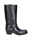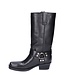 Zwart leren westernboots uit de nieuwe winter 2025 collectie van het Italiaanse schoenenmerk Julie Dee, artikel IV066 Crust Nero. Deze mooie Italiaanse kuithoge cowboyboots zijn geheel van zacht mat glanzend glad leer, met vast voetbed, zijn leer gevoerd en hebben een rubber zool zonder profiel. De laars heeft een westernhak die iets schuin naar binnen loopt met houtlook motief. Door de stevige hak loopt de laars heel comfortabel. Dit model heeft geen rits, je trekt de laars aan door middel van de beide lussen vast te houden en zo de laars aan te trekken. Als je een hoge wreef hebt gaat dit meestel lastig. Met behulp van een plastic zakje om de voet of een gladde nylon sok maak je het aantrekken makkelijker. Doordat de schacht tube van vorm is blijft de voet op de wreef vast zitten in de schoen en bij de enkels zit het wijd. Het kan zijn dat bij het lopen de hiel iets omhoog komt, dat is even wennen, maar de schoen moet als prettig "meelopen". Het leren spoor met metalen ring en studs maken deze iconische westernboots helemaal af. Het spoor zit vast tussen de laars en de hak. Dit is zeker een musthave deze winter! Top model, stoer, klassiek western en toch vrouwelijk door de Italiaanse uitvoering.