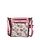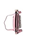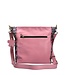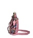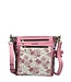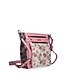 Roze imitatie leren dames schoudertas/crossbody tas uit de lente/zomer 2026 collectie van het Franse merk Laura Vita. Artikel Aria 01 Rose. Deze handtas is heel mooi bewerkt met een bloemenprint. De kleuren roze, rood, lila, geel, groen en blauw zijn gebruikt. De voorkant, achterkant en de lange schouderband zijn gemaakt van roze leer. De zijkant en onderkant van de tas heeft het gebloemd patroon. Op de voorkant zit een mooi vak met geborduurde bloemen in de kleuren roze, wit en groen. De voorkant heeft twee ritsvakken en de achterkant één. Mooi detail is de sleutelhanger met roze leren bloem eraan. Het Laura Vita logo is zichtbaar bevestigd in het mat goud. Alle accessoires zijn mat goudkleurig.