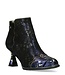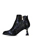Donkerblauw suède enkellaarzen met botanisch motief en bewerkt met zilver, goud, brons glitter. Opvallend detail is de slanke zwart glanzende hak, ingezet met gekleurde strass stenen. Lees meer..