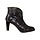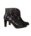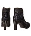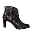 Zwart suède dames korte laars uit de collectie van het Franse merk Laura Vita. Artikel SL316 ALCBANEO -135 NOIR. Deze dames enkel laars is heel mooi bewerkt: met een patroon voor over de neus en de bovenrand afgewerkt met een schulprand en het suède is bedrukt met diverse dessins als een bloem, luipaard en stof dessin, waarin kleurschakeringen voorkomen van brons, grijs en blauw. De patronen zijn vast gestikt met een geel met rood en oranje en groen draad. Mooi detail is de V-uitsnijding voor aan de bovenrand. Dat maakt het model extra elegant aan de voet.
