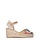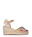 Beige dames espadrilles van het Spaanse merk Pedro Miralles, artikelnummer 17731-03 Talima Beige. De espadrilles zijn gemaakt van beige suède gecombineerd met beige linnen waarop heel fraai geborduurd is met meerkleurig fluweeldraad en gouddraad. De schoen binnenin is gevoerd met zacht leer, heeft een vast voetbed en de rubbere zool is naturel van kleur. De sleehak is gemaakt van het bekende espadrilles touw met een goud draad er door heen. De sandaal sluit met een smal bruin leren bandje met goud kleurige gesp. Een mooie, kleurige espadrille met de bekende goede pasvorm van Pedro Miralles. Combineer het met een zomerse jurk. De hakhoogte is 8 cm en de plateauhoogte is 3 cm.