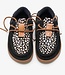Heel mooi zijn deze zwart suède veterschoenen gecombineerd met zwart koehaar met witte print en bruin leren details. Komt uit de nieuwe 2025 herfst/winter collectie van het Spaanse merk Satorisan, artikel Kwahu Winter Fantasy Black. Deze trendy schoenen zijn gemaakt van de beste kwaliteit winter suède, verrijkt met dikke volnerf leer details in het bruin en zwart. Bovenop de schoen is zwart koehaar gebruikt bewerkt met een witte print. De schoen heeft een uitneembaar voetbed en is gevoerd met een fluweel zachte stof van 100% biologisch katoen. De voering is zacht, comfortabel en warm voor de koudere maanden. De ronde leren veters en de handgestikte details geven de veterschoen een uniek en speels karakter. De rubber zool heeft een bruine rand en combineert mooi bij de leren veters. de onderkant is groen, voorzien van een profiel.