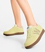 Geel suède dames sneakers uit de nieuwe lente/zomer 2026 collectie van het Deense merk Woden, artikel WL647 Bjork Suède 274 Wax. Deze super mooie sneaker is licht van gewicht, heeft een uitneembaar kurk voetbed en een toffee kleurige "natural soft" loopzool met klein profiel. De voering en de tong zijn gemaakt van stof wat heerlijk zacht draagt. Mooi detail is het beige visleren stukje boven aan de hiel, die geven de retro gymp net even een speciale touch. Op de neus zijn gaatjes in het leer geperforeerd. Het merk logo is zichtbaar op de tong, achter op de hiel en met een grote W aan de zijkant van de schoen. Woden werkt met het grootste respect voor het milieu op basis van de duurzame kernwoorden: Reduce, Re-use en Recycle.