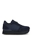 Donkerblauw stof met suède en leer gecombineerd, dames sneakers uit de nieuwe winter 2025/26 collectie van het Deense merk Woden, artikel WL599 Ronja Plateau 009 Dark Navy. Deze stijlvolle sneaker is licht van gewicht, heeft een uitneembaar kurk voetbed en een zwarte zool met donkerblauwe lijn. De tussenzool is gemaakt van lichtgewicht kunststof (EVA). De zwart rubber loopzool is met stukjes kurk gemeleerd en heeft een antislip profiel. De voering is gemaakt van stof wat heerlijk zacht draagt. Het merk logo is zichtbaar op de tong en achter op de rubber hielkap. Het plateau is 2,5 cm hoog en bij de hak 3 cm. Een stijlvol en comfortabele sneaker, die je outfit iets speciaals geeft.